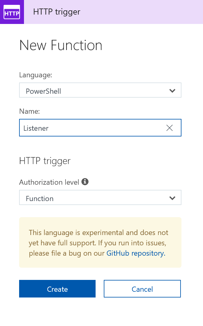 Functions can have different triggers as well as various inputs and outputs. For our example, we’ll go with the “HTTP trigger” function. This function will run whenever it receives a HTTP request. Set the Language to PowerShell and the Authorization level to Function.