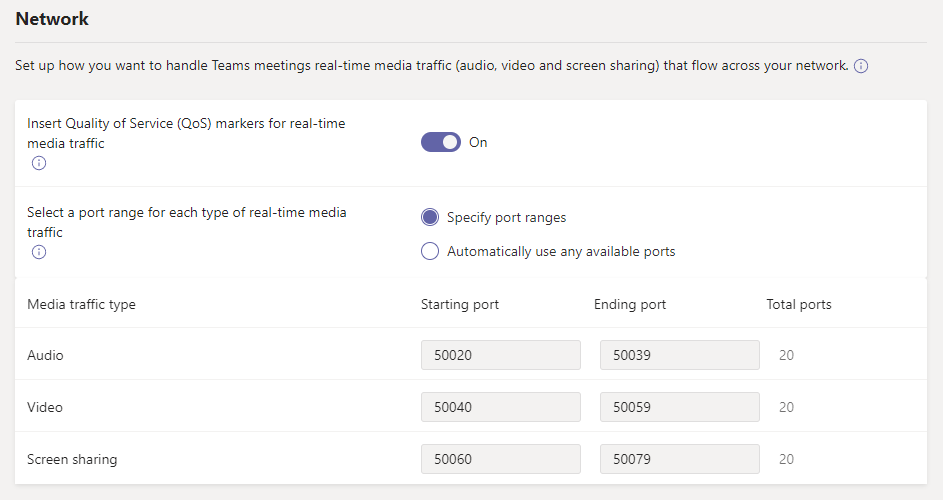 For the above configuration to make any sense, we first have to specify a port range for each modality in the Microsoft Teams admin center.