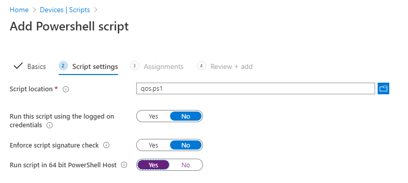 So here we are trying to configure QoS settings on our Windows 10 clients but CSPs are of no great help. Luckily we can use PowerShell to configure policy-based QoS and Intune provides an easy way to deploy PowerShell scripts to our clients.