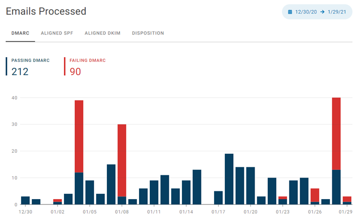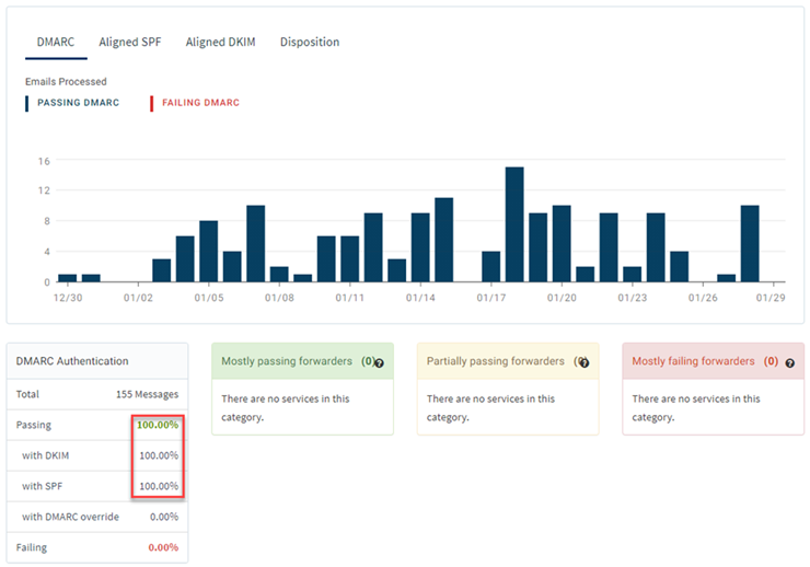 The ultimate goal is to set the DMARC policy to p=reject thereby telling any receiving system to reject emails that fail authentication. Before we can do that, we must make sure all legitimate emails pass authentication. The monitoring helps us verify exactly that, the example in the following screenshot shows outbound emails from our systems for the last month. As you can see, all of them authenticated successfully: